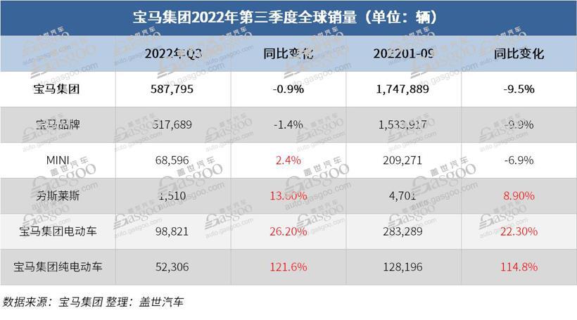 10月10日,宝马集团公布第三季度在全球范围内的销量达587,795辆,同比微跌0.9%。其中,除宝马品牌微跌(-1.4%)之外,MINI和劳斯莱斯品牌销量均实现增长。另外值得一提的是,宝马集团电动车销量同比上涨26.2%至98,821辆,其中纯电动车销量更是同比大涨121.6%至逾5万辆。