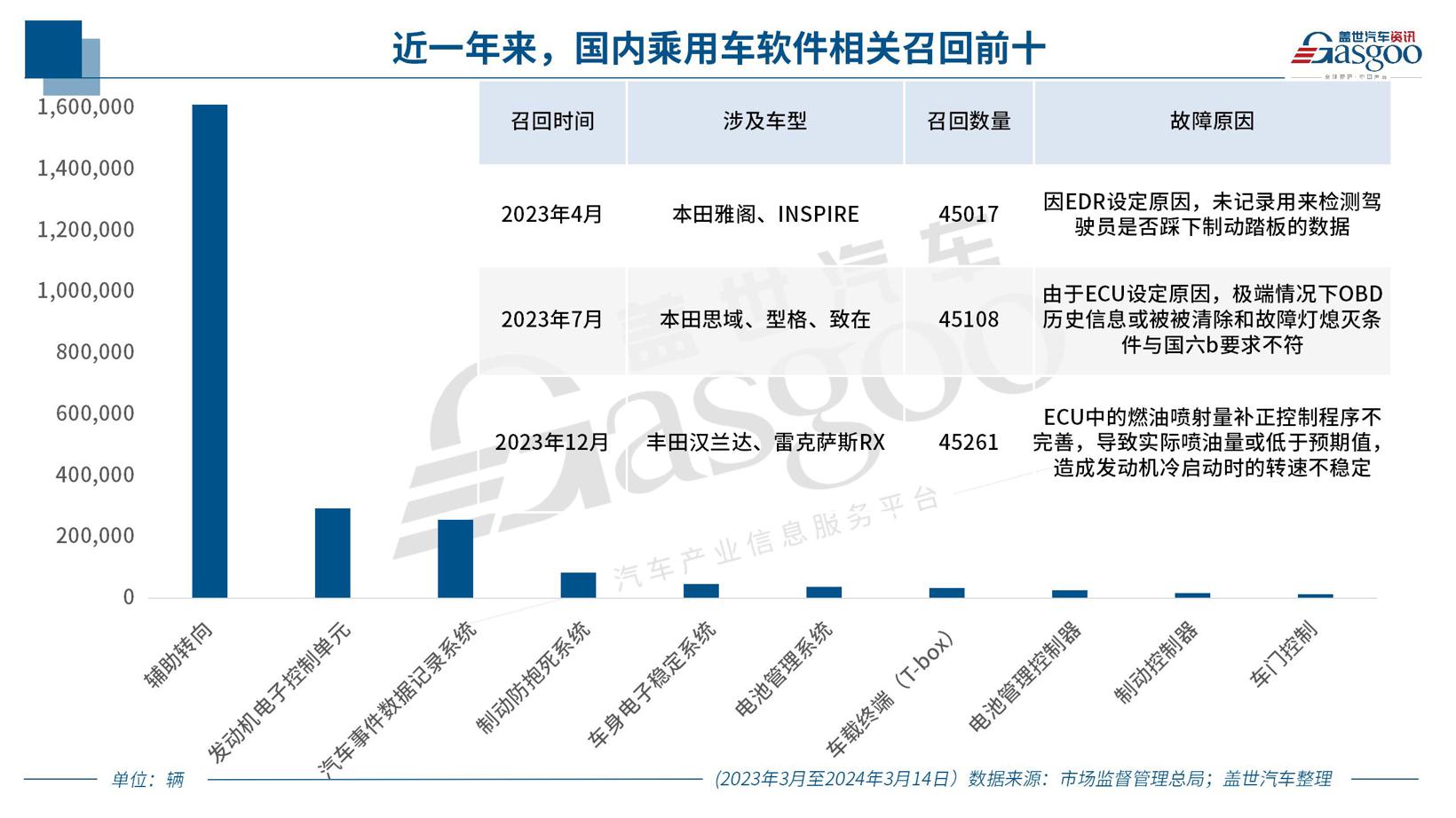 单以过去一年来看,除辅助驾驶相关软件缺陷外,本田、丰田汽车均身陷发动机电子控制单元相关故障中,涉及缺陷车辆29万余辆,占同期召回总量的11.68%。与此同时,动力电池管理系统及相关控制器缺陷召回亦不断被关注,涉及品牌丰田、奔驰及奇瑞,相关召回车辆超6万辆。