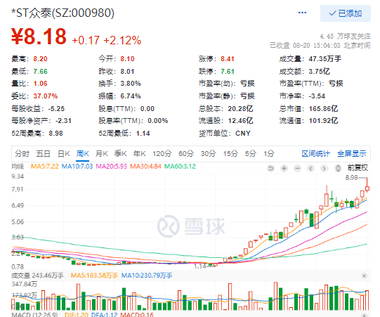 52周最高价8.98元,在威马官方回应“没有任何兴趣参与众泰重组”的消息后,众泰汽车在A股市场的股价在8月18日却创下了近3年时间里的历史新高。