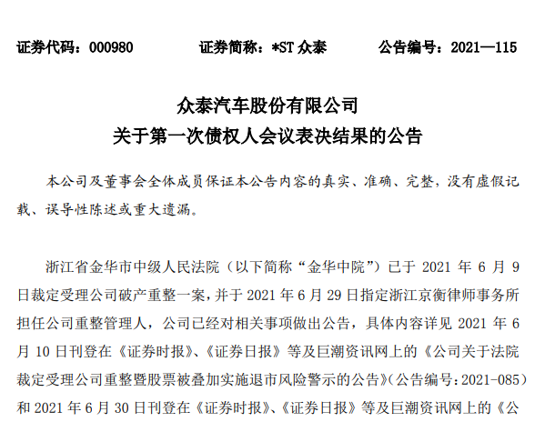 在8月17日的公告中,众泰汽车宣布了第一次债权人会议表决通过《财产管理与变价方案》和《管理人继续执行职 务议案》。《财产管理与变价方案》主要内容为财产管理和未纳入重整范围财产变价的 基本原则和规则,本次《财产管理与变价方案》不涉及债务清偿安排。