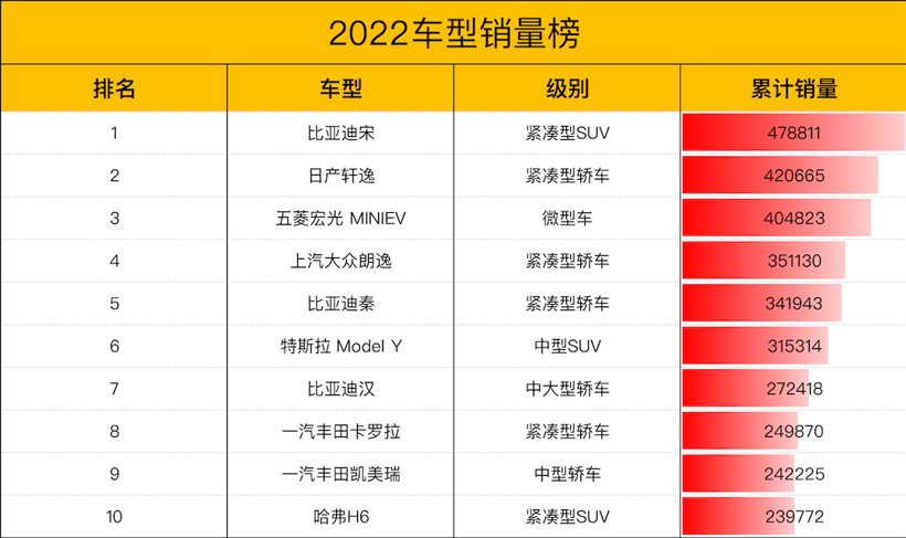 2022年已经结束,不久前国内外车企也正式公布了在中国市场各个车型的累计销量,从销量数据中来看,整体市场依旧是偏向紧凑型轿车以及紧凑级SUV的,单一车型累计销量前10名中有2款紧凑型SUV,4款紧凑型轿车,不大不小的尺寸日常驾驶和停车都非常方便,而且紧凑型这个级别的车型价格相对都比较亲民。但是随着国内用户消费升级,像比亚迪汉、一汽丰田凯美瑞这样的中大型轿车和中型轿车也出现在了2022年单一车型销量榜中,那今天我们就一起来看看,去年国内还有哪些车型入榜吧。