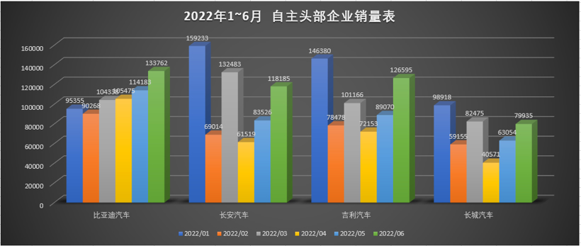 5月比亚迪刷新自身的最高纪录达到11.4万辆,接着6月更是达到13.4万辆,这也使得其连续3个月获得自主品牌的榜首之位。上半年下来,比亚迪的总销量达到64.3万辆,超过吉利和长安一个身位。