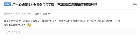 一位广州的网友分享了自己的保养经历,“我是2009款(天语SX4)的车主,从前海珠区那个厂家的4S关闭了,我就去到广汕公路那边(的)4S(店)。后来还去了番禺那边的4S(店),不过这些4S(店)目前都关闭了”。