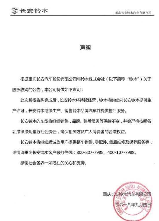 在完成长安铃木的股权交割后,铃木承诺,“将继续向长安铃木提供生产许可,长安铃木继续生产、销售铃木品牌汽车并提供售后服务”。长安汽车也表示,“将全力支持长安铃木持续经营”。