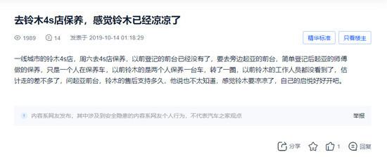 一位天津的网友表示,“以前(负责)登记的前台已经没有了,要去旁边起亚的前台,简单登记后起亚的师傅做保养,只是一个人在保养车,以前铃木是两个人保养一台车……问起亚前台,铃木的售后支持多久,他说也不太知道”。