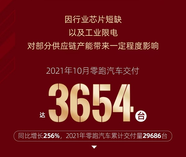 刚刚过去的10月,据零跑官方公布的数据显示,因为遭遇行业芯片短缺,以及工业限电,对其部分供应链产能带来一定程度的影响,所以仅交付新车3,654辆,表现稍显逊色。