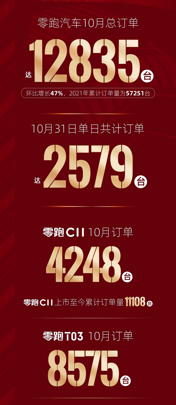 10月,零跑T03订单量同样达到创历史新高的8,575辆。受此推动,零跑品牌总订单量达到12,835辆,环比增长47%,2021年累计订单量57,251辆。