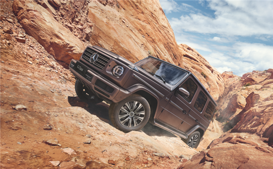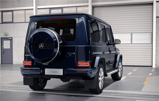 车身侧面和尾部依旧与现款相同,侧面笔直的腰线贯穿车身,视觉效果颇为硬朗。同时黑色的双五辐式轮圈搭配较高的离地间隙,强调其自身硬派越野属性。车尾部分依旧配备了外挂式备胎,这也是奔驰G级标志性的元素。