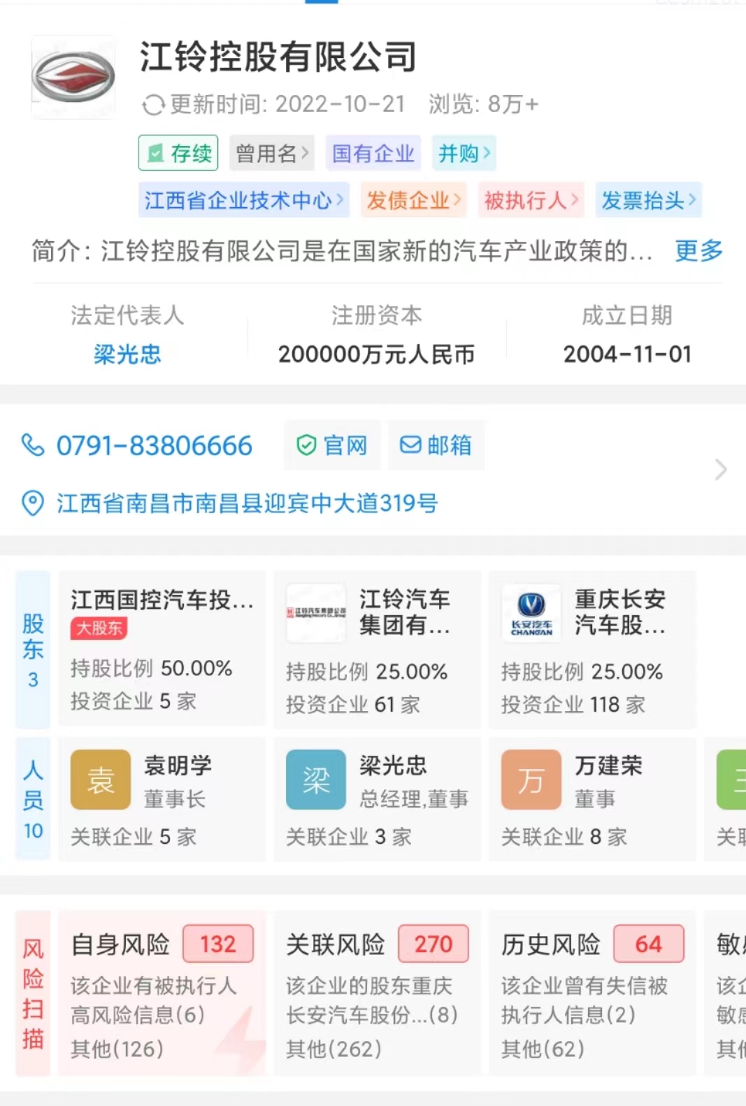 资料显示,江铃控股成立于2004年11月,注册资本20亿人民币,法定代表人为梁光忠,由江西国控汽车投资有限公司、重庆长安汽车股份有限公司、江铃汽车集团有限公司联合持股,持股比例为50:25:25,经营范围含生产汽车、汽车零部件等。