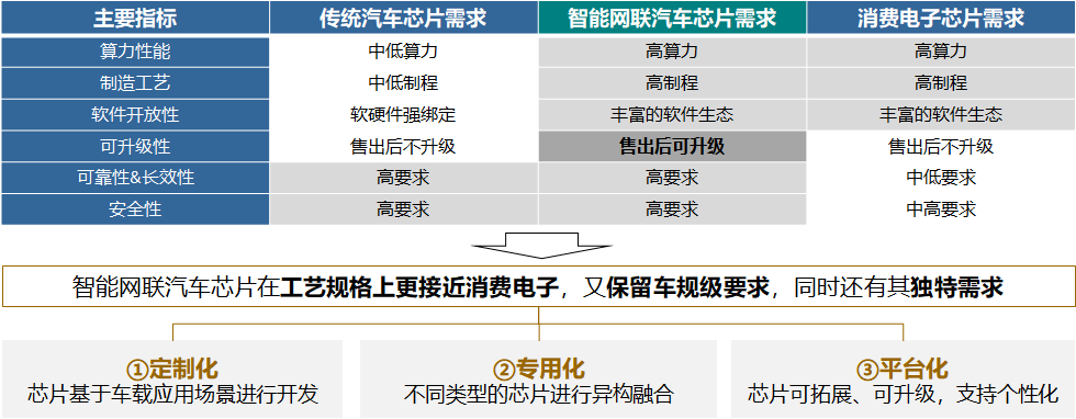 智能网联汽车芯片开辟了全新的技术领域。对于智能网联芯片、传统汽车芯片和消费电子芯片,我们从算力、制造工艺、软件开放性、可升级性、可靠性和长效性、安全性等方面对比,详见图2。对比之后可以得出结论:智能网联芯片是全新的芯片类型,具有独特的功能和性能要求。