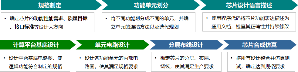我们把整个芯片的开发分成七个步骤,分别是规格制定、功能单元划分、芯片设计语言描述、计算平台基地设计、单元电路设计、分层布线设计和芯片合成仿真。具体内容参见图3。