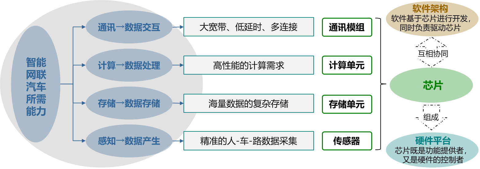 从智能网联汽车所需要的能力来看,智能网联汽车具有的通讯能力、计算能力、存储能力、感知能力都依托于芯片。另一方面,从智能汽车的软硬件架构来看,软件赋能硬件,使硬件的功能和性能得以最大化地发挥,并且由软件来定义体验。而所有的软件架构开发都是要基于芯片的功能性来进行开发,软件和芯片必须紧密融合在一起,否则软件不可能有效地驱动芯片和硬件,软件架构离不开芯片的支撑。同时,芯片也是组成硬件架构平台各个关键节点的核心组成部分,芯片既是功能提供者,又是硬件的控制者,并且芯片承担着打通软件和硬件的关键任务。因此,芯片是汽车产品升级的关键支撑,在智能汽车发展中具有关键作用与战略意义。