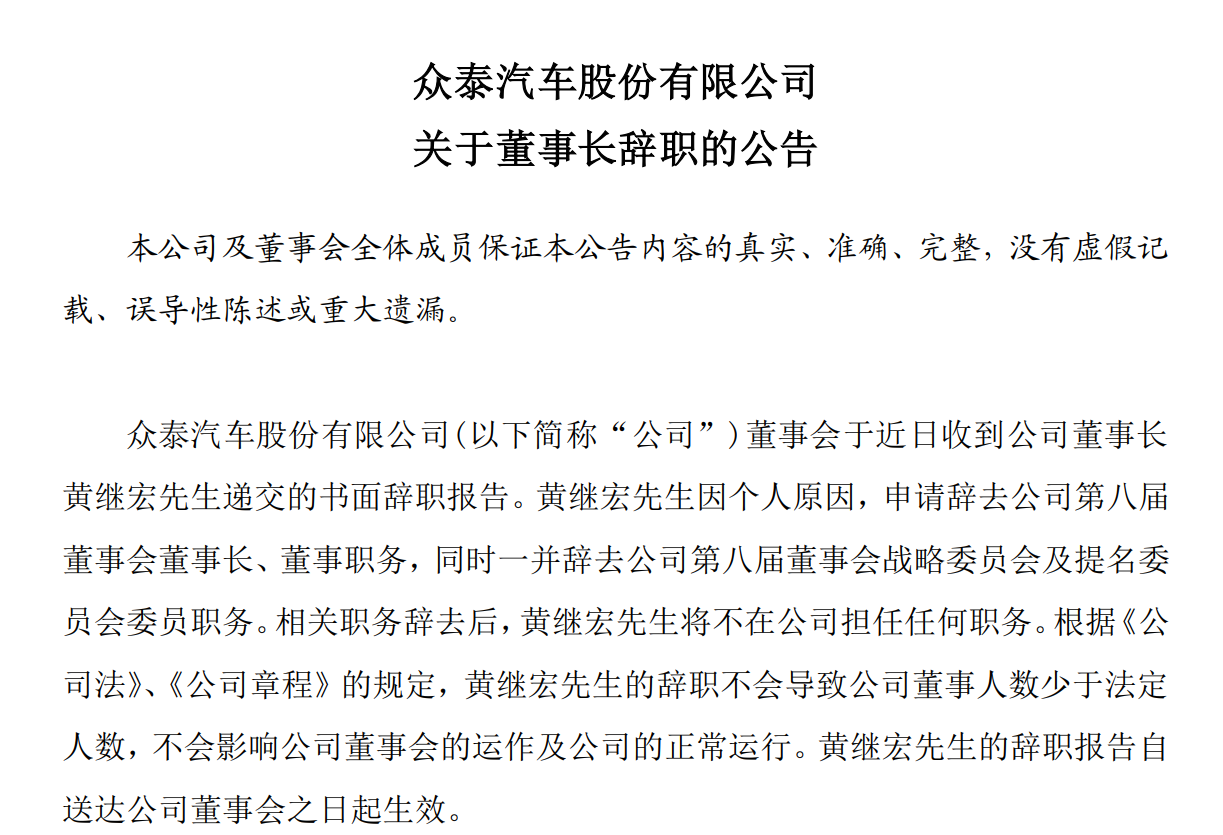 众泰汽车表示,黄继宏因个人原因,申请辞去公司第八届董事会董事长、董事职务,同时一并辞去公司第八届董事会战略委员会及提名委员会委员职务。相关职务辞去后,黄继宏将不在公司担任任何职务。黄继宏的辞职报告自送达公司董事会之日起生效。