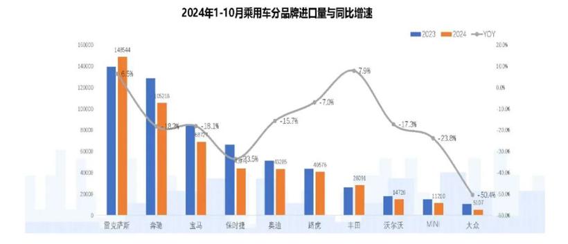 从进口车品牌结构来看,1-10月超豪华汽车累计下跌32.96%,非豪华汽车销量累计下跌21.91%,豪华车下跌13.35%。在销量占比上,豪华车仍然是销量主力,1-10月累计占比稳定在90.84%。