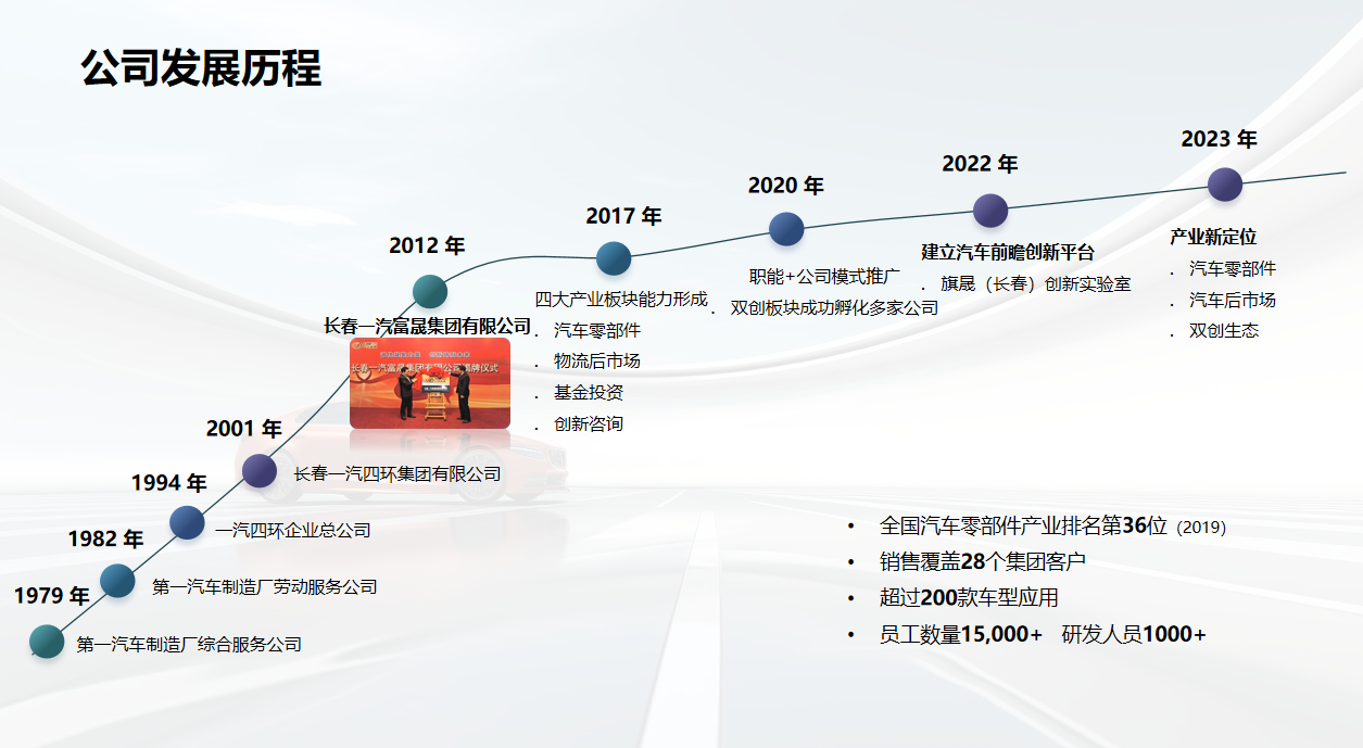 一汽富晟创立于1979年,自成立集团后,随着业务的发展逐渐建立起了几大板块,包括汽车零部件、汽车后市场和双创生态。近几年,我们与中国汽车工业协会合作成立了一家新公司,结合汽车零部件企业咨询、产教融合、创新等开始了新的探索。
