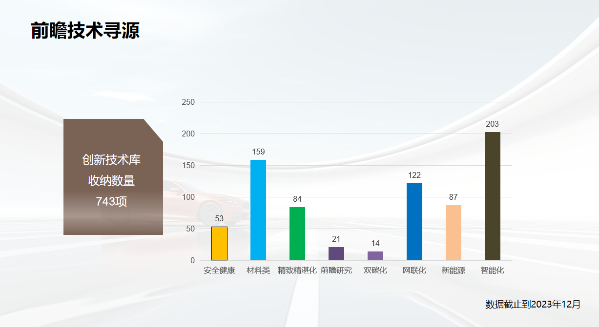 近年来,我们的技术来源大多集中在较发达的城市,与顶尖学府的人才有诸多合作。截至2023年12月,我们的创新技术库已收纳743项,氛围安全健康、材料类、精致精湛化、前瞻研究、双碳化、网联化、新能源和智能化。