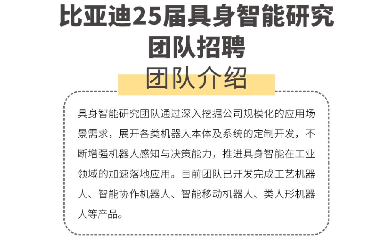 近日,“比亚迪招聘”官方公众号发布25届具身智能研究团队专场招聘信息,宣布面向机器人领域招聘高级算法工程师、高级结构工程师、高级仿真工程师、高级硬件工程师等岗位。