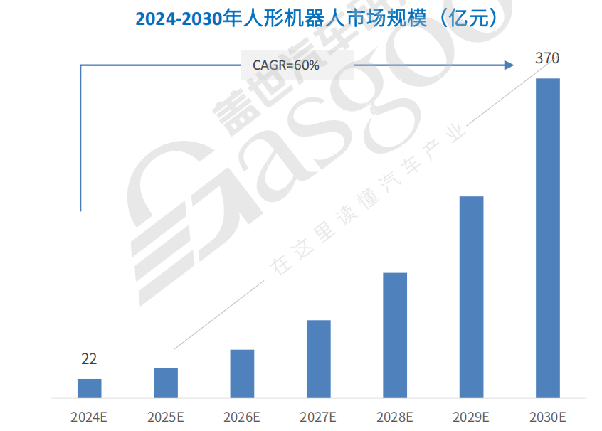其中仅中国人形机器人市场,据车友星部落研究院测算,2024年市场规模就将达到22亿元,预计到2030年将增长至近370亿元,2024-2030年年均复合增长率(CAGR)超60%。同期,中国人形机器人销量将从约0.4万台增长至近27万台,彰显出强劲的市场增长潜力。