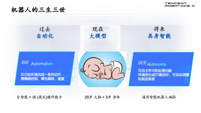即便当前已经进入大模型时代,也并不代表已经实现了具身智能。在腾讯首席科学家、腾讯Robotics X实验室主任张正友看来,当下的机器人相当于20岁大脑放在3岁的身体上,机器人虽然拥有一定的移动能力,但是操作能力非常弱。“真正的具身智能要能够自主学习和处理问题,对环境变化和不确定的时候能够自动调整和规划,这是我们认为具身智能能够通往AGI或者是打造通用智能机器人非常重要的过程。”张正友表示。