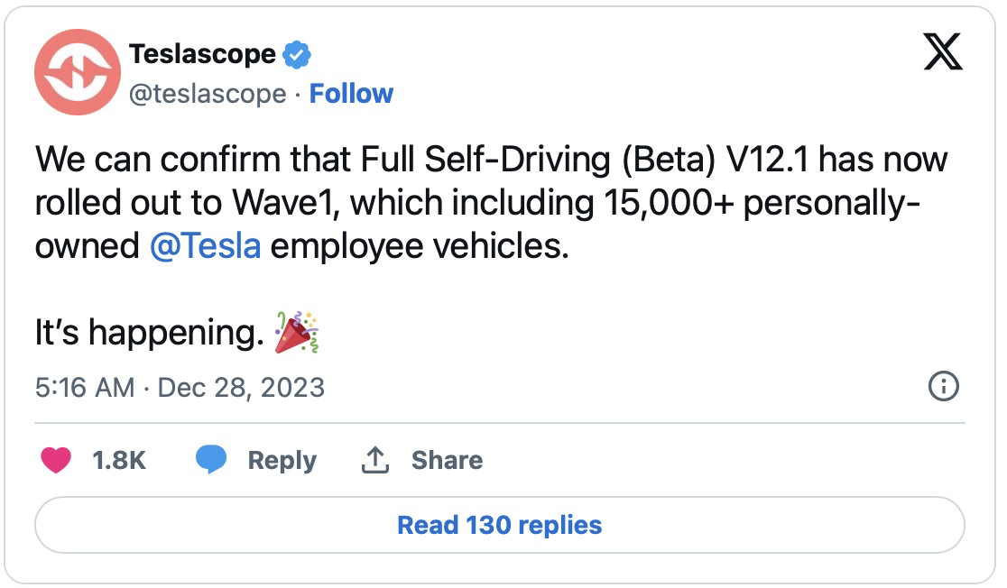 12月28日,Teslascope在社交媒体平台X上证实,特斯拉已经开始向首批车辆推出FSD测试版V12.1,其中包括超过1.5万辆特斯拉员工的个人车辆。今年以来,FSD测试版V12.1一直备受期待,因为它有望过比过去的版本获得很大改进,转向基于神经网络的城市驾驶操作。