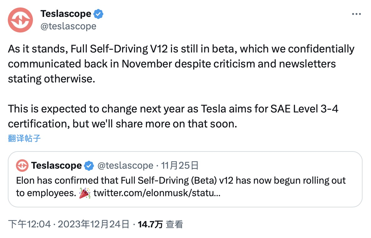 此举让业内猜测,特斯拉是否会在不久的将来向公众部署FSD测试版V12.1,一些人甚至预测,特斯拉最快会在1月中旬向公众提供FSD测试版V12.1。