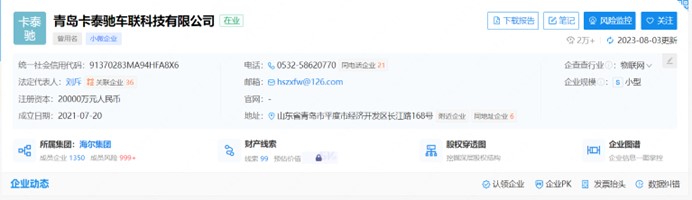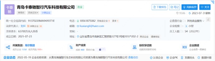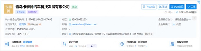 2022年11月,青岛卡泰驰汽车科技发展公司再次注册成立,业务范围涉及新兴能源技术研发、汽车销售、新能源汽车整车销售、汽车零配件零售等。值得一提的是,卡泰驰系列公司,均由海尔集团100%控股。