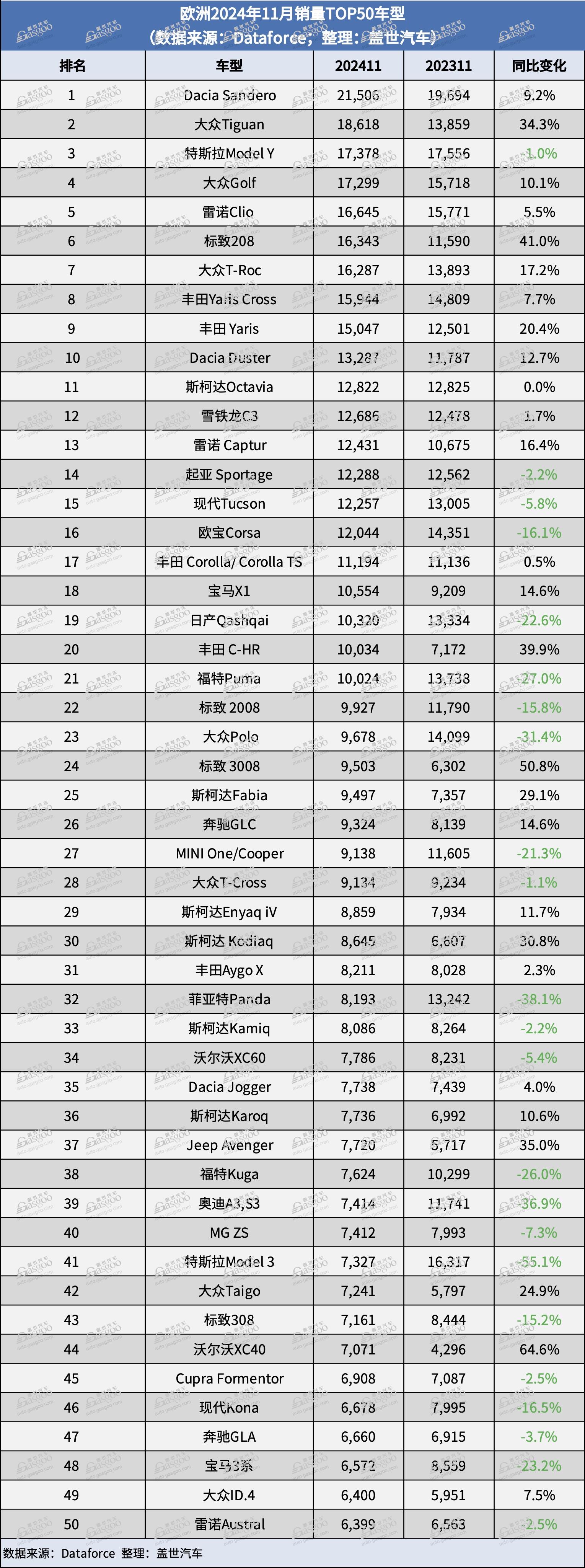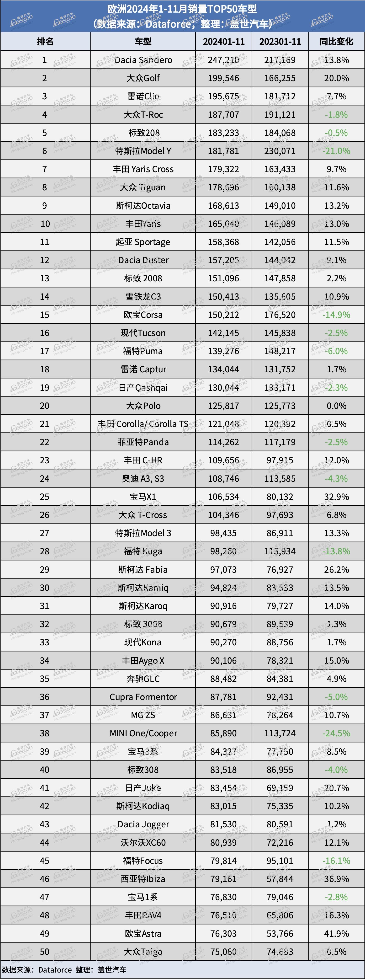 在11月份欧洲销量前50的车型中,大众品牌有7款车型进入前50名,斯柯达品牌共有6款,丰田有5款车型上榜。就前十一个月的销量而言,大众和丰田品牌各有6款车型进入前50名,紧随其后的是斯柯达(5款)、标致(4款)、Dacia(3款)。
