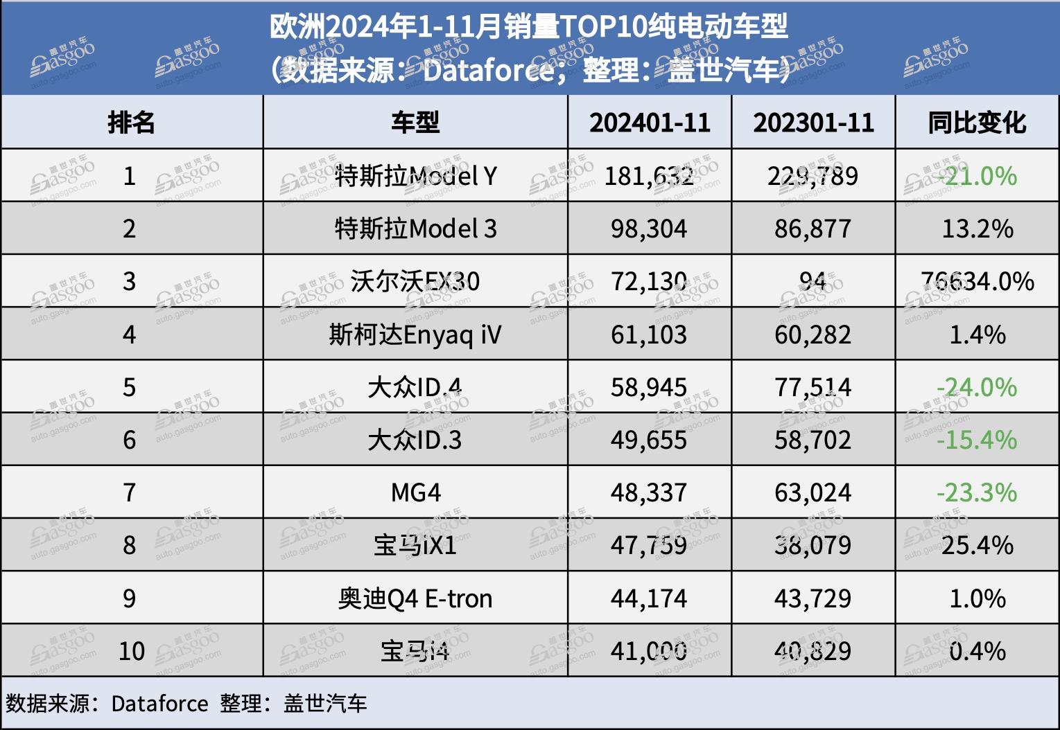 11月份欧洲纯电动汽车的销量同比微跌0.4%,1-11月的销量下滑1.4%。尽管欧洲市场纯电动汽车的销量逐月下降,但今年的累计销量预计将与去年基本持平。